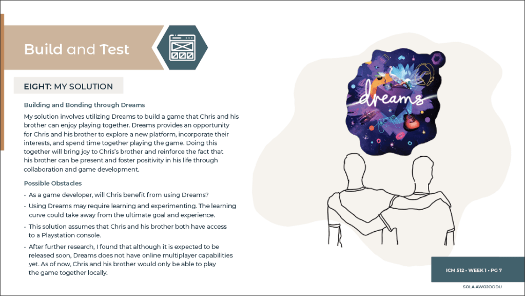 If I were to do the course over, I would likely create a physical prototype. My final solution was more of an experience, not a physical item. While prototyping, I felt limited. I took to creating a visual representation digitally. I now understand that prototyping also requires thinking out of the box. Moving forward, I would like to improvise better and find a way to represent the experience effectively. This could mean using play-doh or legos to model the experience.
